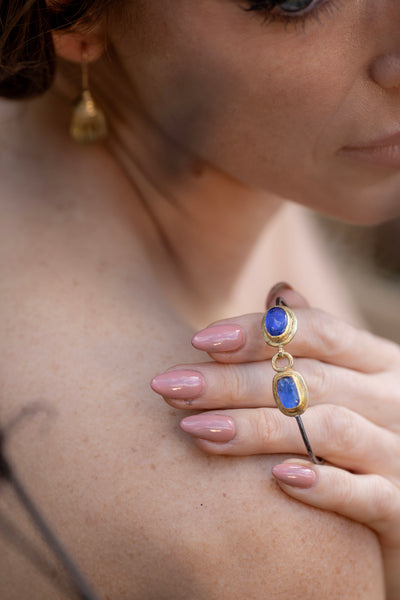 “A refined, slender bracelet featuring two vivid tanzanite cabochons framed in solid 18k gold. A tiny ruby accents the handcrafted clasp, all set on an oxidized silver band. Designed to sit comfortably and securely on a smaller wrist, this piece blends rich color with understated sophistication.”