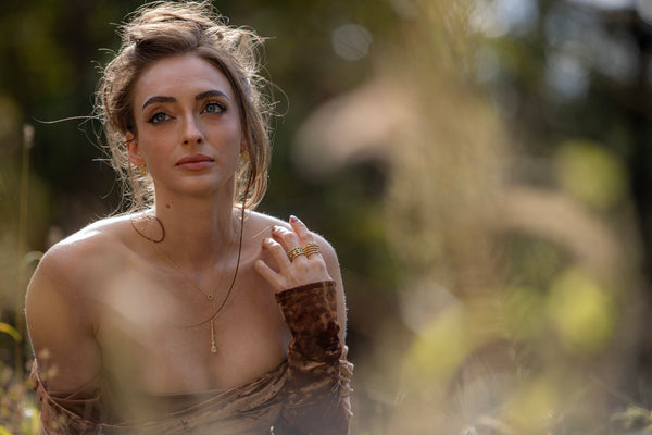The Sun Water Lariat is a delicate yet luminous necklace crafted in rich 18K gold, designed to draw the eye with its flowing, water-like movement and warm golden glow. A sequence of hand-finished gold elements creates the vertical drop, each segment subtly textured to catch light like ripples across sunlit water.