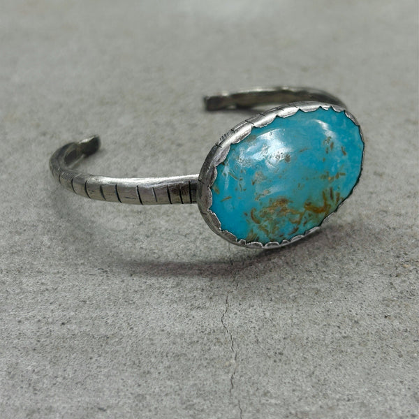 This handcrafted sterling silver cuff features a striking, large Sleeping Beauty turquoise cabochon—known for its vivid sky-blue color and minimal matrix. The bracelet is beautifully hand-carved, with detailed silver work that has been oxidized to perfection, enhancing the depth, character, and vintage aesthetic of the piece. Designed to fit a small to medium-sized wrist, this cuff offers a bold yet timeless statement for any turquoise lover or collector.